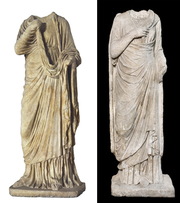 La Padova romana subì nel tempo rovinose distruzioni, per questa ragione dell'apparato decorativo si conserva pochissimo. Tra i manufatti superstiti due statue femminili, acefale: la prima (a sinistra), rinvenuta al Canton del Gallo, è una derivazione da un originale greco; la seconda (a destra), artisticamente più modesta, è di provenienza sconosciuta. Entrambe sono riferibili al II secolo d.C. Musei Civici agli Eremitani - Museo Archeologico © Foto Musei Civici di Padova