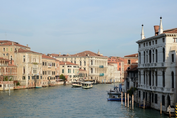 Dal ponte dell'Accademia, verso est, si può godere della splendida vista che offre la parte finale della via d'acqua più importante di Venezia, prima di sfociare nel Bacino di San Marco; sullo sfondo, verso destra, svettano le ben note cupole della Basilica di Santa Maria della Salute.