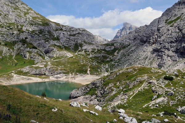 Il piccolo specchio d'acqua color smeraldo del Coldai è un tipico esempio di lago glaciale in alta quota, sovrastato dalle vertiginose pareti del Monte Civetta, che appartiene al terzo dei nove sistemi dolomitici inseriti nella Lista Unesco del Patrimonio Mondiale.
