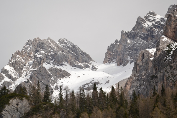 Tra le vette più alte e più famose delle Dolomiti, il Monte Cristallo, che vediamo qui dal Passo Tre Croci, appena imbiancato dalla prima nevicata d'autunno, chiude a nord la conca dell'Ampezzano, scenario di eccezionale bellezza paesaggistica e naturalistica.