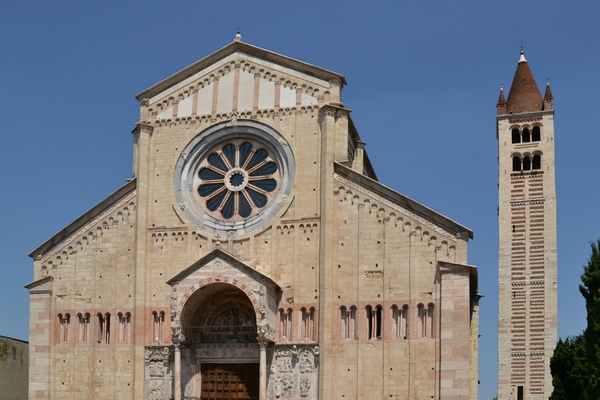 La famosa basilica, dedicata al santo patrono di Verona, dopo una lunga serie di vicende edilizie, venne ricostruita nel 1138, in stile romanico, di cui rappresenta senza dubbio uno dei vertici in tutta Italia. Sulla facciata, eccezionale la decorazione pittorica e scultorea del protiro, del portale e del rosone. All'interno, nel presbiterio, è la Pala di Andrea Mantegna, collocata nel 1459, capolavoro dell'arte rinascimentale.