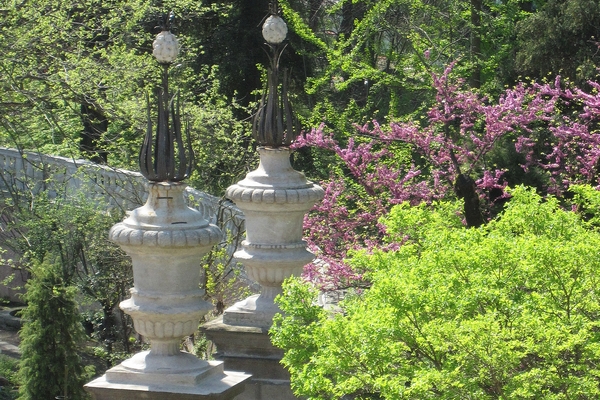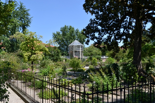 Il muro circolare che racchiude l'orto antico, suddiviso al suo interno in quadranti e settori dedicati alle diverse specie vegetali, presenta quattro magniloquenti accessi, in corrispondenza degli assi ortogonali, ciascuno decorato da elementi scultorei in pietra e in metallo.