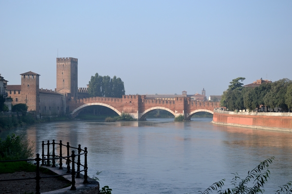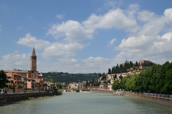 In questa prospettiva il corso del fiume sulle cui sponde è nata la città appare affiancato dalla torre campanaria della basilica medioevale di Sant'Anastasia, a sinistra, e, a destra, dal colle di San Pietro, che in epoca romana vide sorgere l'edificio del teatro, ancora in parte conservato, in uso per rappresentazioni sceniche all'aperto.