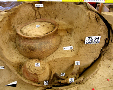 L'olla e il grande boccale monoansato costituivano i due ossuari della tomba. Gli oggetti di corredo, senza la possibilità di attribuzione specifica ai due destinatari, erano rappresentati dall'anello in ferro e dalle monete, due assi dei tresviri monetales. Necropoli nord-est dell'Annia, I secolo d.C