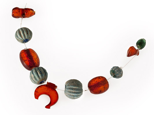 Dieci elementi di collana infantile in ambra, fayence e vetro verde. Perle in fayence configurate a melone unite ad una serie di vaghi d'ambra anche conformati ad amuleto, come il crescente lunare e il fallo. Necropoli nord-est dell'Annia, I secolo d. C