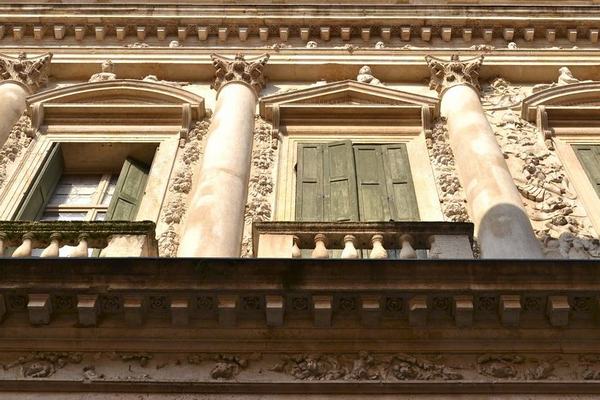 La famiglia Canossa si rivolse all'architetto Sanmicheli per la costruzione del suo palazzo privato, che venne in seguito affrescato dai migliori pittori veneti del Cinquecento. L'intervento è contemporaneo a quello in Palazzo Bevilacqua: numerosi, infatti, sono i caratteri comuni ai due edifici. (Foto: Marco Marchese)