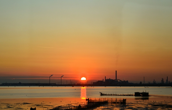 Al margine della Laguna di Venezia, il polo industriale di Marghera, che qui vediamo profilarsi contro il cielo al calar del sole, sullo specchio d'acqua immobile, con le reti dei pescatori in primo piano, rende evidente come il contesto ambientale odierno sia costituito da un'ormai inscindibile unione tra l'elemento naturale e la millenaria presenza dell'uomo, con le sue opere e le sue attività.