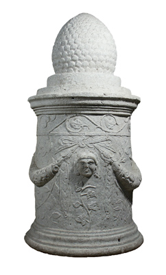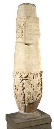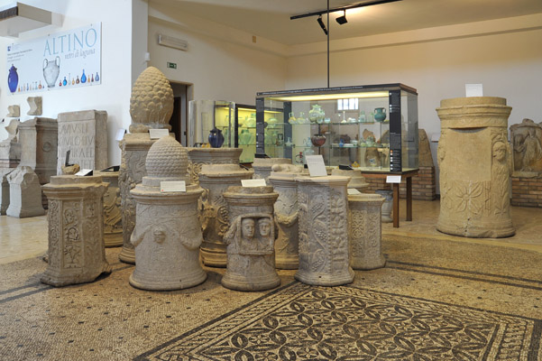 Museo Archeologico Nazionale di Altino - Altare funerario cilindrico in calcare d'Aurisina decorato da festoni di frutta e fiori cinti da nastri allacciati sopra tre volti femminili; il fusto presenta una decorazione a motivi vegetali. Un elemento a pigna funge da coronamento. Necropoli sud-ovest dell'Annia, I secolo d. C