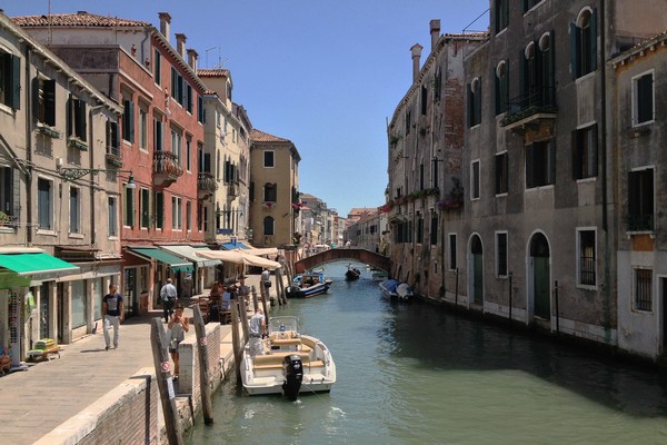 Guardando verso ovest, dal Ponte dell'Accademia, si scorge la «volta de Canal», ovvero il punto in cui la principale via d'acqua di Venezia compie un'ultima curva, prima del tratto finale che sfocia nel Bacino di San Marco; tra gli splendidi palazzi che vi si affacciano è possibile notare sullo sfondo, al centro, Ca' Rezzonico, ora sede del Museo del Settecento veneziano.