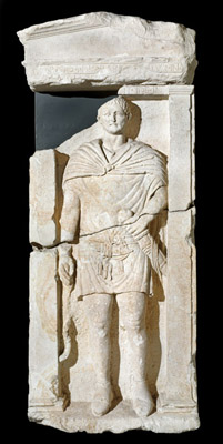 Stele funeraria a pseudo-edicola dedicata a Minucio Lorario. Il centurione è rappresentato in tenuta militare, con mantello (sagum) sulle spalle trattenuto da una fibula; con la mano sinistra trattiene la spada (gladium), con la destra il bastoncino di vite (bacillum viteum), simbolo di potere. Il pugnale (pugio) è appeso alla cintura. Rinvenuta in via Orus, è databile alla fine del I secolo d.C. Musei Civici agli Eremitani - Museo Archeologico © Foto Musei Civici di Padova