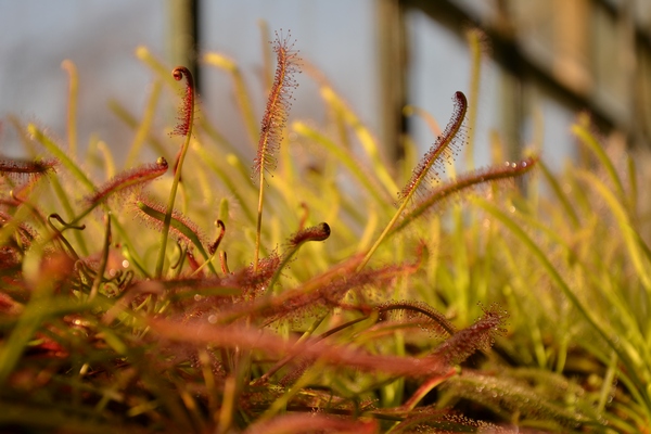 Riparata nelle serre ottocentesche dell'Orto Botanico di Padova, questa pianta insettivora ha le foglie densamente ricoperte da minuscoli e sottilissimi tentacoli, ai cui apici si distinguono le gocce appiccicose che servono a intrappolare le prede.