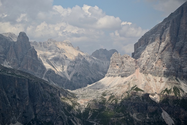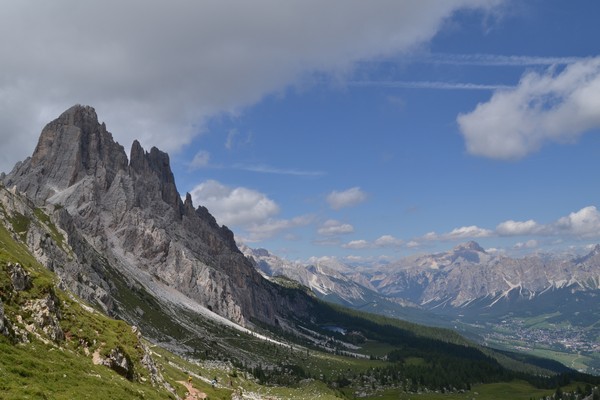 Dalla Forcella Ambrizzola lo spettacolare panorama sulla conca dell'Ampezzano mostra, in primo piano a sinistra, la frastagliata sagoma della Croda da Lago, che domina il piccolo specchio d'acqua azzurra del lago Federa, distinguibile al centro; sullo sfondo il massiccio del Pomagagnon e a valle, verso destra, la famosa località turistica di Cortina, perla delle Dolomiti.