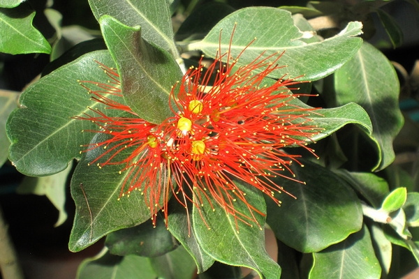 Il caratteristico fiore, dai lunghi e sottili filamenti color cremisi, appartiene a un piccolo arbusto sempreverde, proveniente dall'Australia e dalla Nuova Zelanda, qui rappresentato da un esemplare messo a dimora nell'Orto Botanico di Padova.