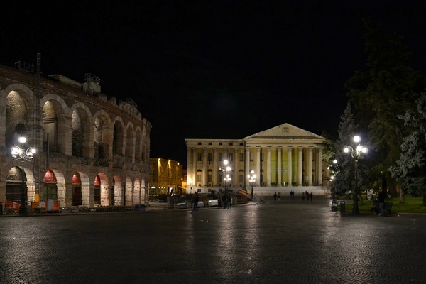 Piazza Bra, uno dei luoghi più conosciuti di Verona, con l'anfiteatro romano e la facciata di Palazzo Barbieri, sede municipale. La vista notturna evoca gli spettacoli proposti dalla celebre stagione lirica dell'Arena, che ogni anno anima l'estate veronese.