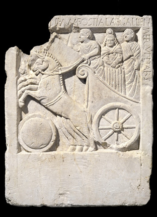 Stele funeraria di Ostiala Gallenia, I secolo a.C. Rinvenuta in via S. Massimo, ben testimonia nell'abbigliamento dei personaggi e nell'iscrizione, il passaggio del mondo protostorico verso l'epoca romana. (foto Musei Civici - Padova)