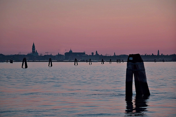 La silhouette di Venezia, vista dalla parte interna della laguna, all'ora del crepuscolo, offre una suggestiva immagine simbolica della città sospesa fra acqua e cielo, un eccezionale contesto urbano in cui architettura e paesaggio si integrano perfettamente, a formare un insieme unico e inscindibile.